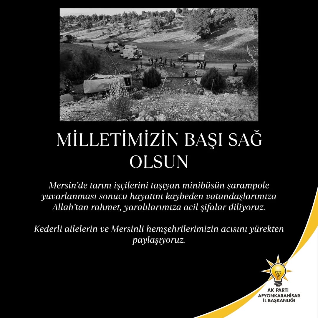 AK Parti Afyonkarahisar İl Başkanlığı, Mersin’de meydana gelen ve tarım işçilerini taşıyan bir minibüsün şarampole yuvarlanması sonucu yaşamını yitiren vatandaşlar için taziyelerini iletti. Kazada hayatını kaybedenler için rahmet, yaralılar için ise acil şifalar diliyoruz ifadelerini kullanan parti yetkilileri, derin üzüntülerini belirtti.